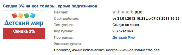 Примерно то же самое было и в публикации, правда более оптимизированные не под вебмастера, а под пользователя. Например, рейтинг публикаовать не стоит. Естественно, что ссылка на Детский мир является реферальной. И в конце стояла приписка – для получения промокода пройдите по ссылке, по которой посетитель попадал на сайт интернет магазина по партнерской ссылке. Сама картинка так же является реф ссылкой.